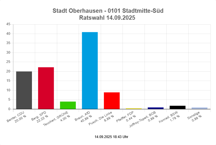 Was fast noch erschreckender ist, als der Durchmarsch der AfD in vielen Teilen des Ruhrgebiets, ist die damit einhergehende geringe Wahlbeteiligung. In diesem Beispiel lag diese bei gerade einmal 17,62%.
